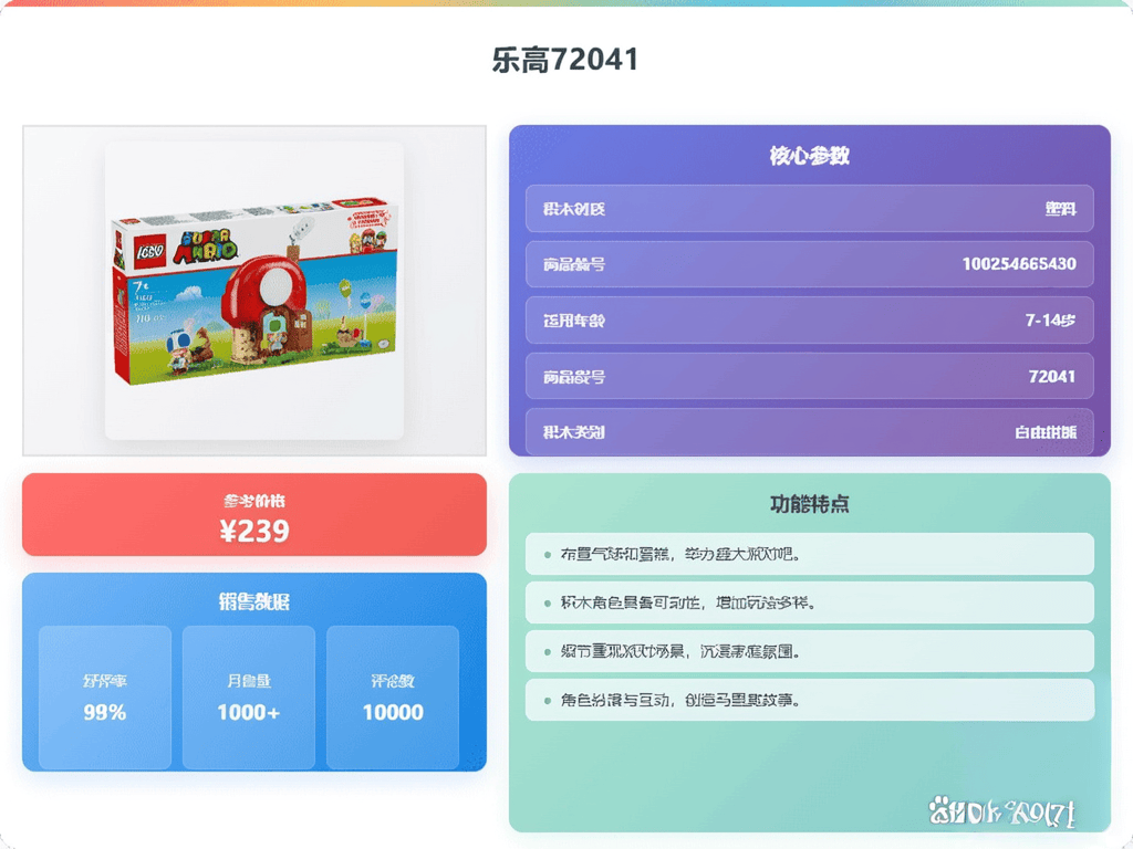 当然,除了情怀和互动性,还得考虑耐玩度。别买那种华而不实,玩两天就坏的。乐高在这方面做得不错,质量有保证,而且很多套装都支持多人合作和创意拼搭,比如乐高72045,可以单人创意拼搭,也能和朋友一起挑战,还能结合APP获得拼装灵感。再说了,丰富的动作体验也很重要!像发射龟壳、漂移、滑翔这些经典动作,加上声音和视觉效果,玩起来才过瘾!还有乐高72032,卡丁车造型酷炫,滑翔翼可拆卸,还有发射装置,这些小细节都能增加趣味性。